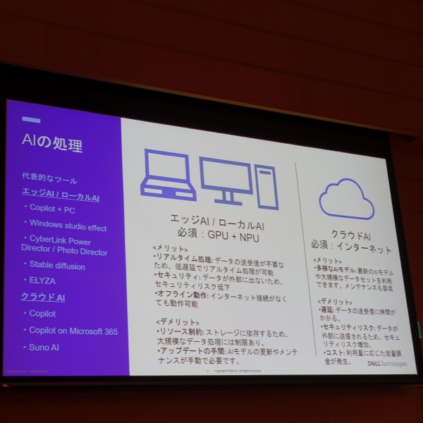 ![]() これからは、「ローカルAI」と「クラウドAI」の違いに関する理解を深めることが重要とのことでした。ChatGPTなんかは、ネットを介して行うクラウドAIですが、セキュリティの関係から、今後はローカルAIが重要視されるので、AI対応PCに注目が集まってきているんですね。
