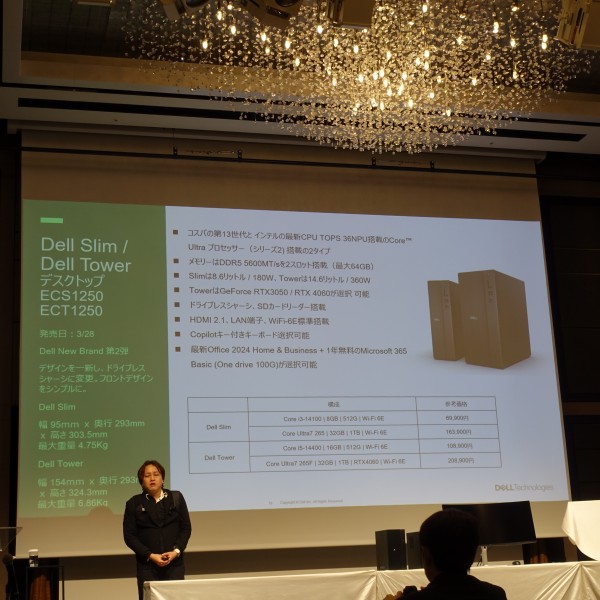 ![]() 新製品の発表に移り、まずエントリータイプのデスクトップPC Dell Slim/Tower(ECS1250/ECT1250)が紹介されました(2025/3/28発売予定)。