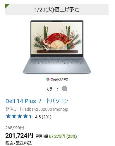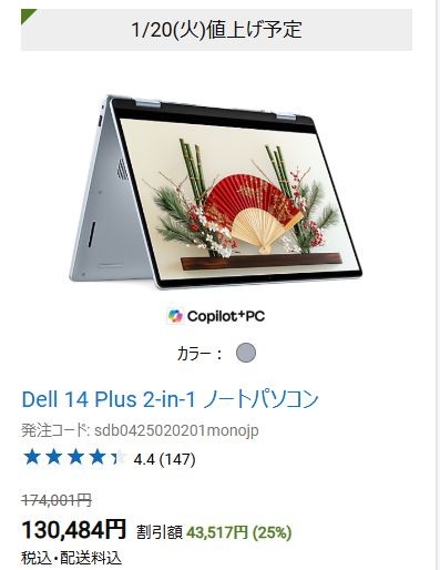 DELLでは、新春大セールを実施中!現在メモリ価格が高騰しており、今後PCが値上げされる可能性があるため、PCの購入を検討している方はお急ぎください。「1/20(火)値上げ予定」という記載があります。 対象ノートPCが最大25%オフで購入できます。僕が確認した限りでは、いろんな使い方ができる2-in-1タイプのプレミアムノートPC Dell 14 Plus 2-in-1が25%オフで購入可能です。