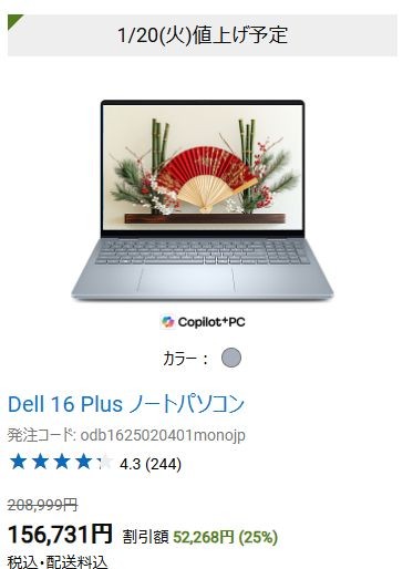 ![]() 16インチパネル搭載のクラムシェルタイプDell 16 Plusも25%オフ。