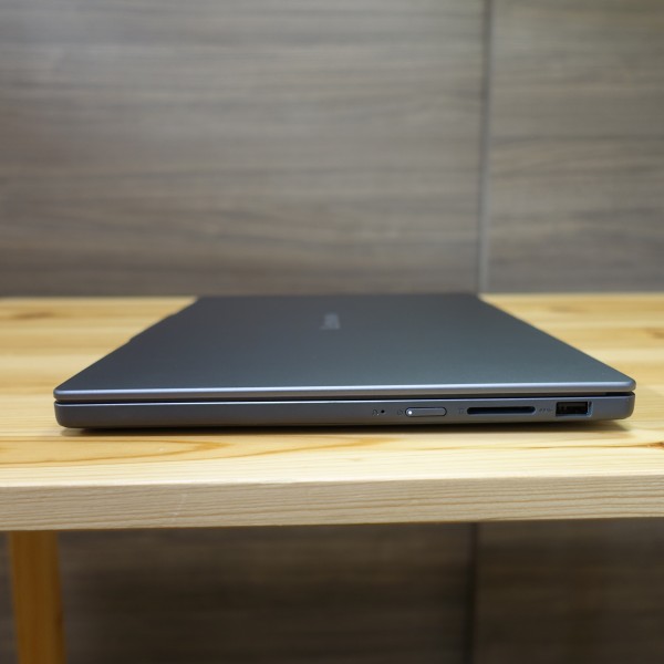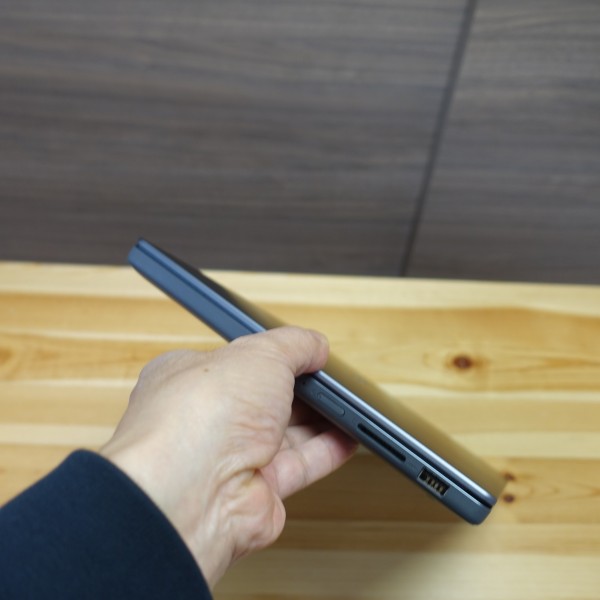 ![]() 右側面部。電源ボタン、SDカードリーダー、USB Type-Aを配置。本モデルはUSB Type-Aを2個、Type-Cを1個の合計3個のUSB端子を搭載しています。