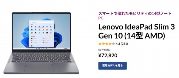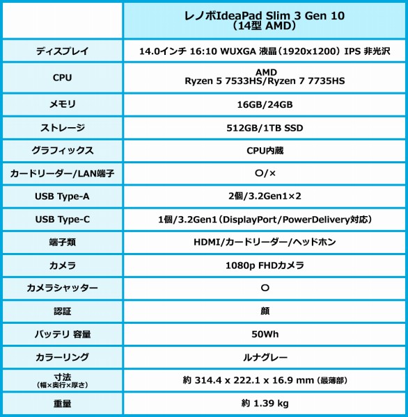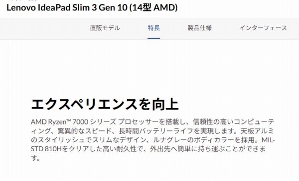 ![]() 以上、IdeaPad Slim 3 Gen 10(14型 AMD)について見てきました。主な特徴をまとめると次のとおり。