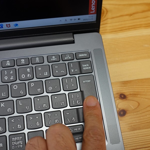 ステレオスピーカーを配置。キーボードの左右にスピーカー穴が設けられています。実際に音楽を聴いてみましたが、少しカシャカシャしてクリア感が少なめかな。すごく高音質というわけではありませんが、コスパ重視のノートPCとしては標準レベルのサウンドに感じました。