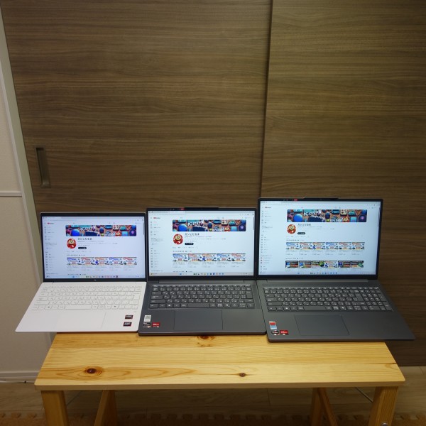 ![]() 13インチ/16インチPCを並べてみました(上の画像の左13.3インチPC/真ん中:レビュー機(14インチ)/右:16インチPC)。