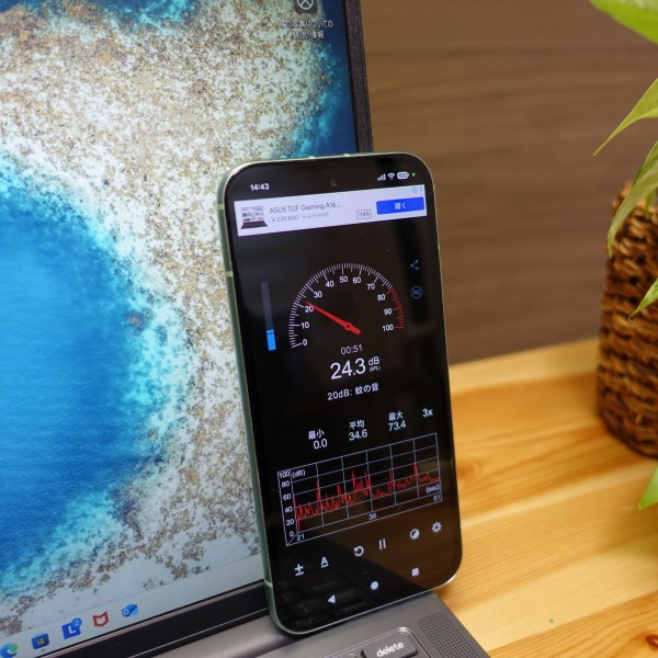 ファンの音をスマホの騒音計アプリで計測してみました。ネットを見るなど一般的な使い方をしているときは22-30dB程度で静か。