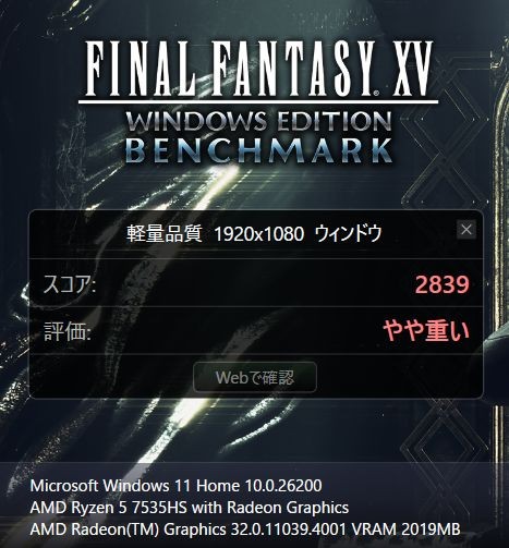 重い負荷のかかるFF15ベンチマークは「軽量品質」で「やや重い」、「標準品質」で「重い」、「高品質」で「動作困難」という結果。
