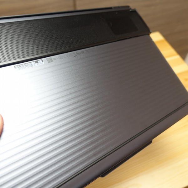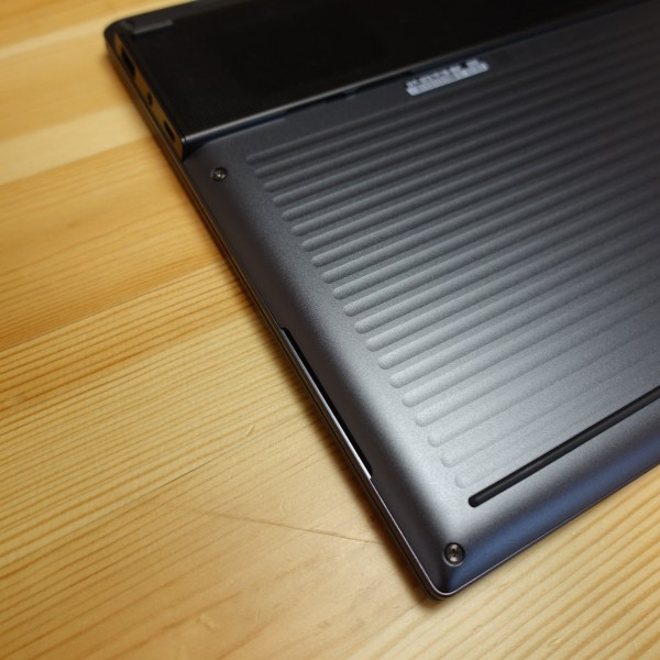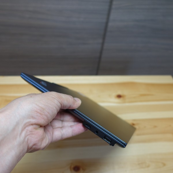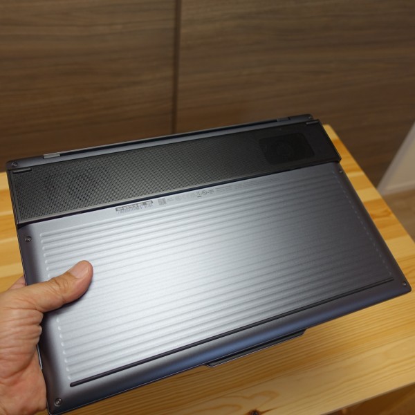 スリムタイプPCなので一見すると堅牢性に不安を感じますが、片手だけで持ってもボディのたわみ等はほとんど感じず、非常にがっしりとしているので安心して持ち運べると思います。