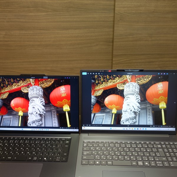 色域の狭いパネルを搭載した16インチPCに同じ画像を映し出してみましたが(上の画像の左:レビュー機(15.3インチ/ DCI-P3 100%)/右:色域の狭いパネル搭載PC(16インチ))、