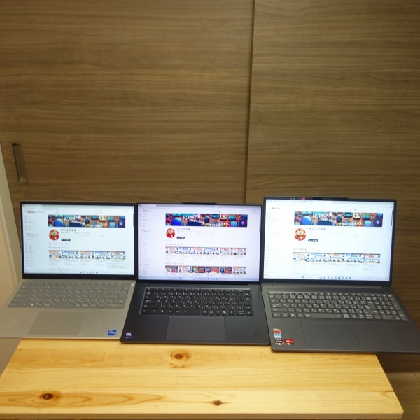 14インチPC/16インチPCを並べてみました(上の画像の左:14インチPC/真ん中:レビュー機(15.3インチ)/右:16インチPC)。