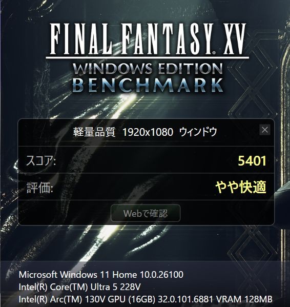 重い負荷のかかるFF15ベンチマークは「軽量品質」で「やや快適」、「標準品質」「高品質」で「普通」という結果。