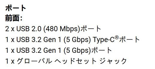 前面部。電源ボタン、メディアカードリーダー、ヘッドセットジャック、USB Type A×3、Type-Cが配置されています。