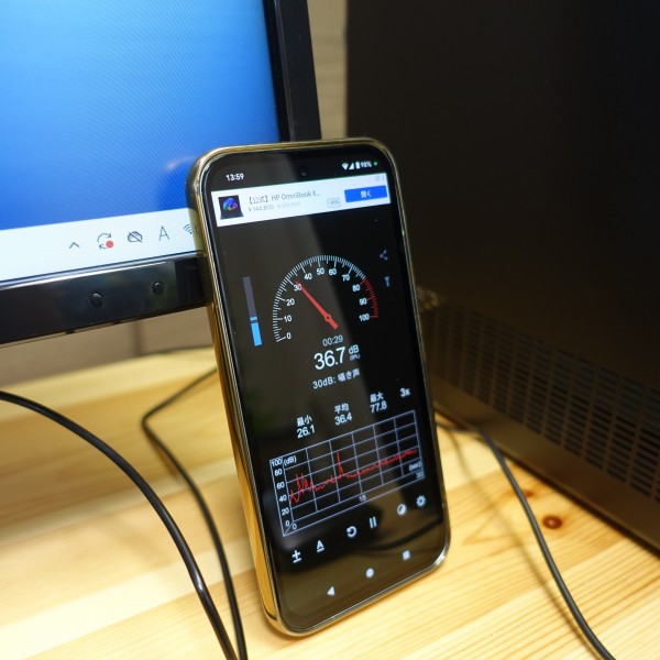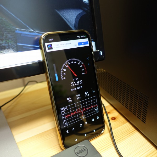 ファンの音をスマホの騒音計アプリで計測してみました。ネットを見るなど一般的な使い方をしているときは31-37dB程度ですごく静か。