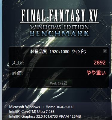 重い負荷のかかるFF15ベンチマークの結果は「軽量品質」で「やや重い」、「標準品質」は「重い」、「高品質」で「動作困難」