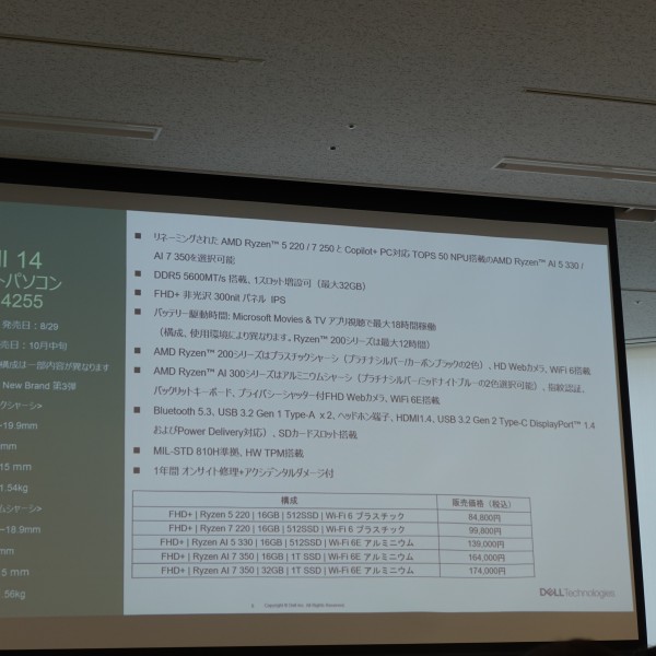 イベントで展示機に触ることができたので、詳しく見ていきましょう。 なお、展示機のため、販売構成とは異なる部分があるのでご注意ください(キーボード/指紋認証など)。 *2025/10追記:Dell 14(AMD)(DC14255)のアルミニウム(Copilot+PC準拠モデル)をメーカーからお借りすることができたのでレビューしています→Dell 14(AMD)(DC14255)アルミニウムモデル(Copilot+PC準拠モデル)レビュー DELL Webサイトの製品ページを確認する →