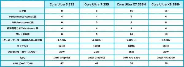 「X」の付いたプロセッサは、内蔵グラフィックス(Intel Arc B390)の性能が高いのが大きな特徴です。