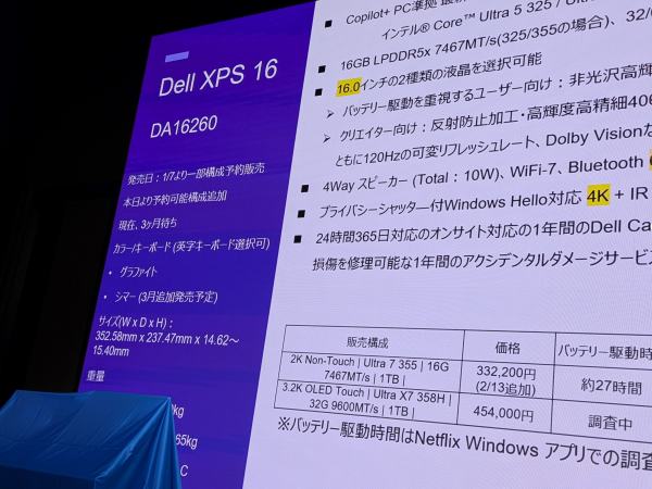 ![]() あとXPSシリーズとしてXPS 14/XPS 16以外にも13インチパネルのモバイルタイプのXPS 13が2026年6月以降に投入される予定とのこと。担当者によると、魅力的な価格設定になるということなので楽しみです。