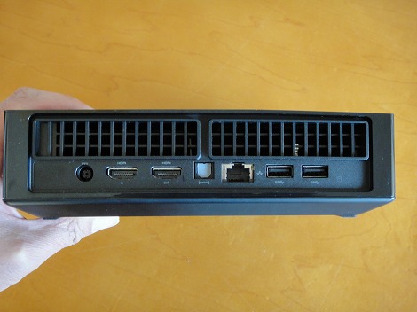 ![]() Alienware Alphaの各パーツについて詳しく見てみましょう。 前面部には、電源ボタンとUSB2.0×2を配置。 ![]() Alienwareの顔が電源ボタンとなっており、電源をオンにするとイルミネーションが点灯します。 ![]() 上面部は、3枚の板をつなぎ合わせたような形状をしています。 ![]() 背面部。2x USB 3.0/1x RJ45 GbE/1x HDMI出力1.4a/1x HDMI入力、1x オプティカルオーディオ出力 (Toslink)/1x 電源入力が配置されています。 ![]() ケーブル類を接続したところです。 5)まとめ