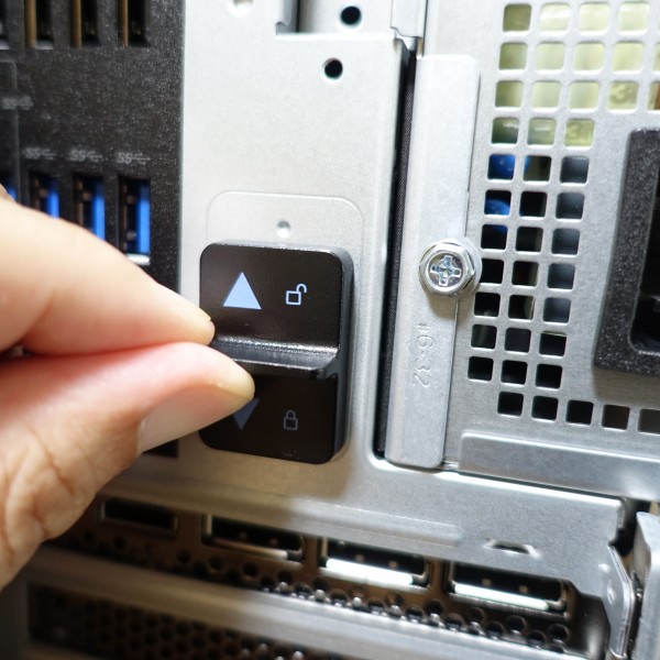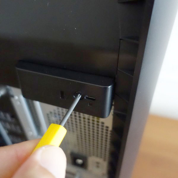 ![]() 筐体内部にアクセスするには、背面部右上にあるサイドパネルリリースラッチ上にあるネジを外します。ドライバを使って外します。