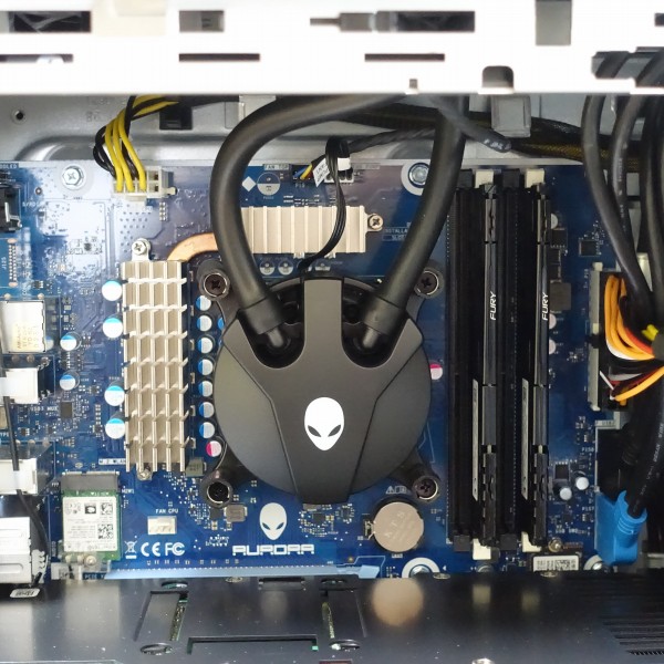 ![]() 中央にCPUを配置。この構成では、CPUが水冷システムで覆われています。Alienwareマークが付いた黒色のパーツが水冷システムです。