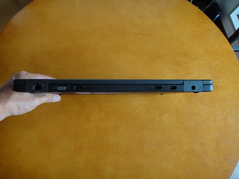 ![]() 右側面部。メモリカードリーダーとUSB3.0端子が配置されています。 ![]() 左側面部。ヘッドホン端子が配置されています。 ![]() 前面部。 ![]() 右端にステータスランプが配置されています。 ![]() 電源をオンにすると点灯し、マシンの状態をチェックできます。 ![]() 背面部。左右に端子が配置されています。 ![]() 左側には、LAN、VGA、USB3.0を配置。 ![]() 右には、HDMI、USB3.0、電源端子を配置。 映像出力端子として、レガシータイプのVGAと普及の進むHDMI端子の2つを搭載しています。ビジネスシーンではまだVGAを使う機会も多いので、この端子を搭載しているのはありがたいですね。 ![]() ただし、背面部の端子に接続する際にはいちいちのぞき込まないといけないのでちょっと面倒。また背面部に一定のスペースを確保する必要があります。 ![]() 底面部。バッテリは内蔵されています。 ![]() オプションでドッキングステーションを接続して機能拡張できる仕様になっています。 4-4)ACアダプタ
