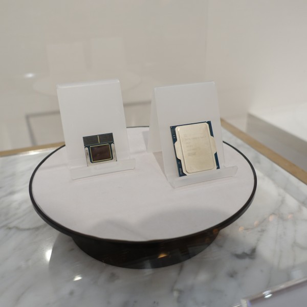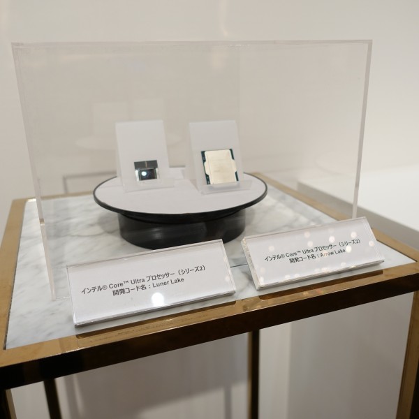![]() 会場には、インテルCore Ultraシリーズ2プロセッサ(Lunar Lake)の実物が展示されていました。上の画像の左側です。右側はデスクトップに搭載されるArrow-Lakeプロセッサ。
