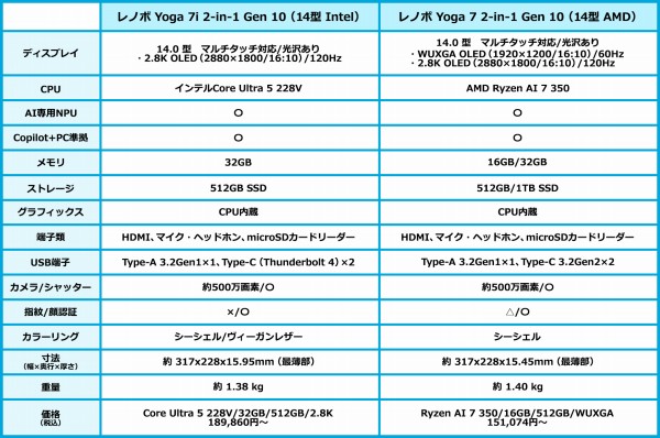 姉妹モデルのAMDプロセッサ搭載のレノボYoga 7 2-in-1 Gen 10(14型 AMD)のスペックも並べてみました。