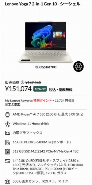 なおAMDモデルの場合、Ryzen AI 7 350/16GBメモリ/512GB SSD/WUXGAパネル の構成が151,074円(税込)。メモリ/ストレージ容量がインテルモデルよりも少なく、解像度が低いWUXGAパネルなので価格はインテルモデルよりも安く設定されています。AMDモデルもCopilot+PC準拠モデルなので、価格重視ならAMDモデルを検討するのもありかも。