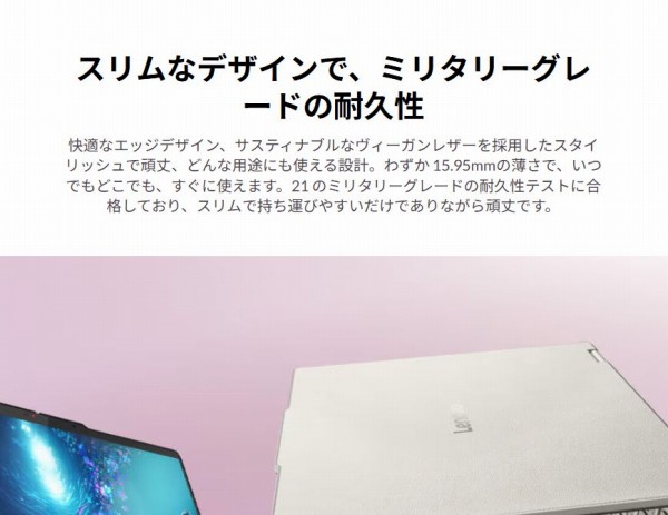 ・14インチパネル搭載の2-in-1 PC ・色表現の鮮やかなOLED(有機EL)パネル搭載 ・インテルCore Ultra 200Vシリーズプロセッサ搭載のCopilot+PC準拠モデル ・天板部にヴィーガンレザーを採用しており、洗練されたデザインに仕上がっている 14インチパネル搭載のコンパクトな2-in-1 PC。インテルCore Ultra 5 228V搭載のCopilot+PC準拠モデルです。OLEDパネルを搭載しており、色表現が鮮やかなため映像を堪能できると思います。 また天板部にヴィーガンレザーが採用されており、洗練された感じに仕上がっています。 状況に合わせていろんな使い方がしたい、AI処理重視のトレンドに乗りたいのでCopilot+PC準拠モデルがいい、綺麗な映像を楽しみたい、高級感のあるデザインのモデルがいいというニーズをお持ちの方にオススメだと思います。 *レノボWebサイトの製品ページを確認する