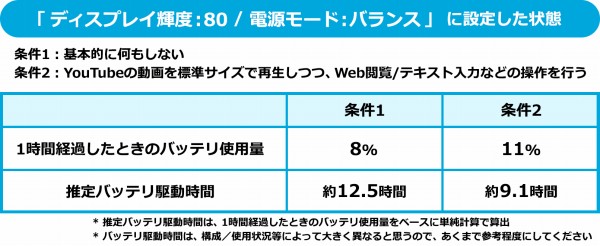 実際にバッテリ駆動時間を計測したところ、条件1の何もしない状態で約12.5時間、条件2の動画再生した状態で約9.1時間バッテリが駆動する計算です。