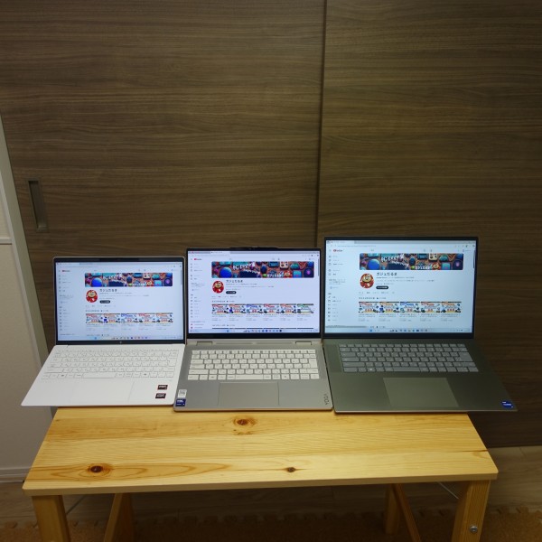 ![]() 13.3インチ/16インチPCを並べてみました(上の画像の左:13.3インチノート/真ん中:レビュー機(14インチ)/右:16インチノート)。