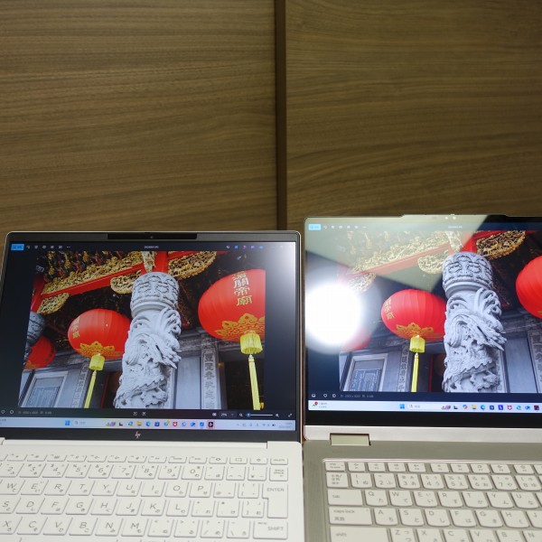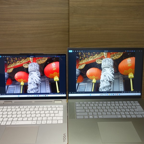 色域の狭いパネルを搭載した16インチPCに同じ画像を映し出したところ(上の画像の左:レビュー機(14インチ)/右:色域の狭いパネル搭載PC(16インチ))、