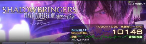 負荷が中程度のベンチマーク「ファイナルファンタジー14 漆黒の反逆者」を実行したところ、「高品質」、「最高品質」とも「非常に快適」という結果。