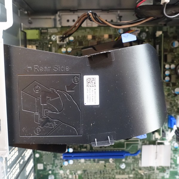 ![]() マザーボード上のCPUを覆う形でファンエアフローカバーが配置されています。このカバーは、CPUから出る熱を、背面部から効率的に排出するために取りつけられています。