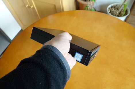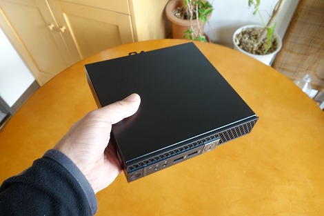 ![]() ボディの寸法は、18.2 x 3.6 x 17.8cm(高さ x 幅 x 奥行き)しかありません。 ![]() 片手で軽々掴める大きさです。最初見たら、とてもデスクトップPCとは思えない大きさ。でも、これで第6世代インテルCore iプロセッサ搭載可能なPCなんですよね。 ![]() こうやって持ってみると小ささがよくわかります。重量は約1.28kg。 ![]() SFF(スモールフォームファクタ)ボディを採用したOptiPlexと比較してみました。右がMFFです。 なおOptiplex 3040 MFFは横置き可能です。 2)スペックをチェック