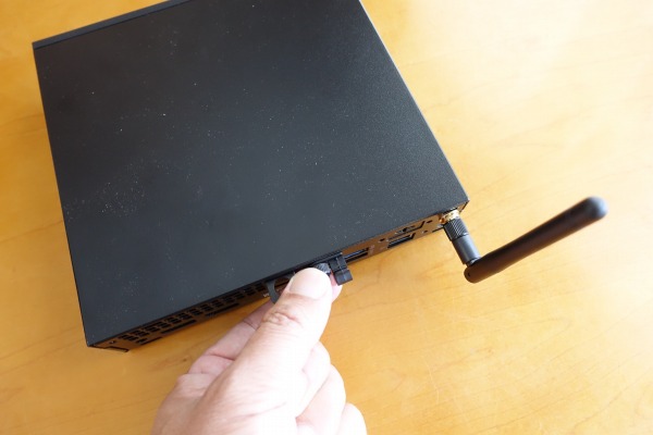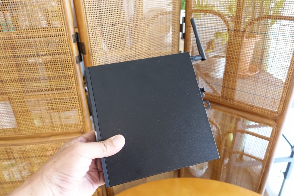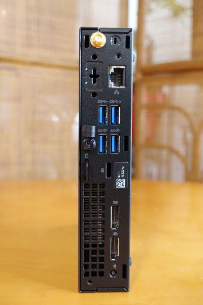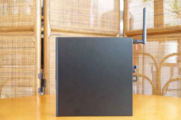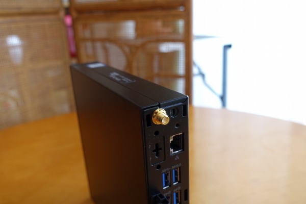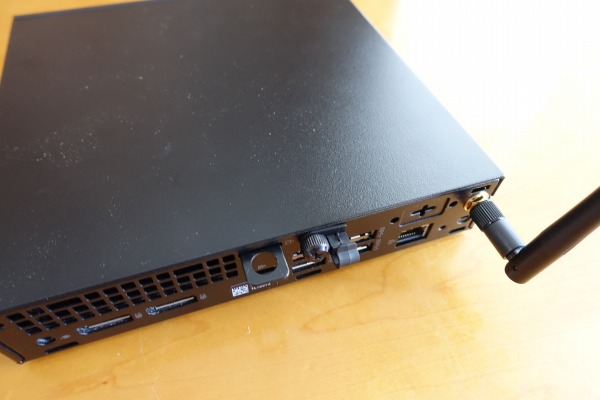 右側面部。前述したようにゴム足が配置されています。 ![]() 背面部。コンパクトなボディに端子類が詰め込まれているのがわかります。 背面部には、USB 3.1 Gen 1 Type-Aポート x 2、USB 3.1 Gen 2 Type-Aポート x 2 、LAN端子 x 1、DisplayPort x 2が配置されています。 ![]() 背面部の一番上にアンテナを装着可能。 ![]() 向きを自在に調整できます。 5)筐体内部に簡単にアクセス可能