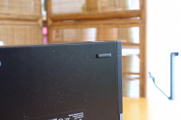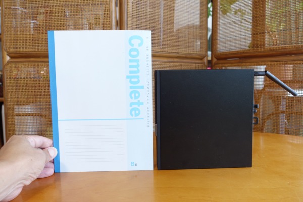 ![]() ボディの寸法は、18.2 x 3.6 x 17.8cm(高さ x 幅 x 奥行き)しかありません。 ![]() ものすごくコンパクト/スリムなボディに仕上がっているので、片手で軽々持ち運べます。 ![]() B5サイズのノートと比べたところ。 ![]() 一見しただけではPCとは思えないつくりです。