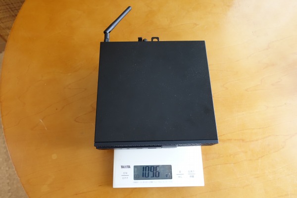 重量は約1.1kg(実測値)。 ![]() コンパクトノートPCと同じくらいの重さなので、気軽に移動できます。 ![]() SFF(スモールフォームファクタ)ボディを採用したOptiPlex 7070 SFFと比較してみました。右がマイクロデスクトップです。こうして比べてみると、マイクロデスクトップの小ささが際立ちます。 ![]() これだけ小さいと、ある程度、場所が狭くても設置することが可能です。
