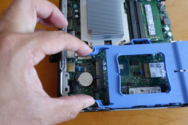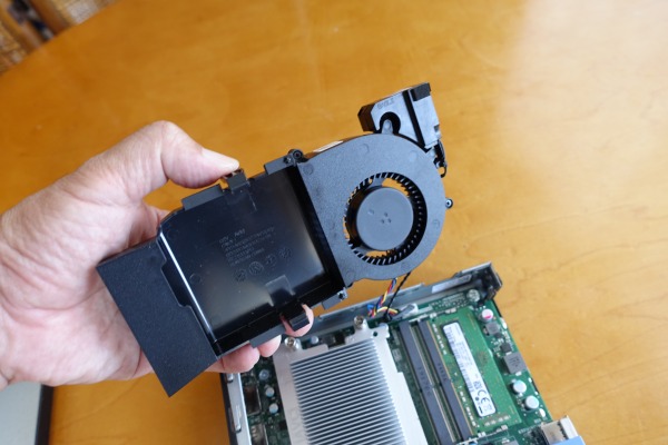 一般的にコンパクトモデルの場合、増設などのカスタマイズ作業はできないモデルが多いのですが、OptiPlex 7070マイクロデスクトップではメモリを増設したり、ストレージを交換したりするなど、ニーズに合わせたカスタマイズが可能です。 ![]() OptiPlex 7070マイクロデスクトップの筐体内部にアクセスするには背面部の中段にあるネジを外します。 ![]() ドライバー等を使わなくても手でネジを緩めることが可能。ツールレスでカバーを外せます。 ![]() ネジを外しきったら、前面部の方向に側面部をずらします。力を入れる必要はありません。 ![]() すると側面部が簡単に外れます。 ![]() コンパクトなボディにパーツ類がぎっしり詰め込まれているのがわかりますね。 ![]() 筐体内部。上の写真の左側が前面部です。上側にCPUファンが配置されています。 ![]() CPUファンは簡単に外すことが可能。 ![]() 矢印が描かれている取っ手部分を、内側に押してやります。 ![]() CPUファンが外れました。 ![]() ただし電源コードが接続されているので、引っ張って破損しないよう注意が必要です。 ![]() CPUファンを外すと、メモリスロットが姿を現します。 ![]() メモリスロットは2つ搭載されています。メモリが1つしか刺さっていない場合は増設することが可能です。 ![]() ブルーのトレイにはHDDを搭載できますが、この構成では非搭載です。 ![]() このトレイも、取っ手を内側に押し込むだけで簡単に外れます。 ![]() あっけなく外れます。これなら簡単にストレージを交換できますね。 ![]() 一番手前にM.2接続のSSDが装着されているのが見えます。 7)ACアダプタをチェック
