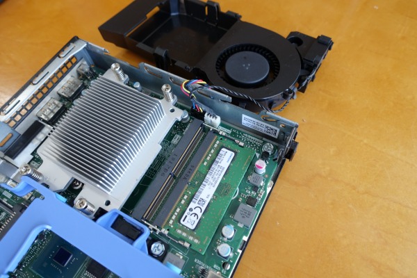 CPUには、インテル第9世代Core i5/i7プロセッサ搭載モデルをを選択可能。 メモリは4/8/16/32GB搭載モデルを選べます。価格重視なら4GBメモリ搭載モデルですが、4GBのメモリ容量だと、負荷のかかる作業や複数のタスクを処理する場合、もたつくケースが出てくると思うので、できれば8GB以上のメモリを搭載することをオススメします。 ストレージは現時点ではHDDに加えて、高速アクセス可能なM.2接続のSSDを選択可能。 光学ドライブは非搭載です。 こうして見てみると、コンパクトボディでありながら、性能面で通常のデスクトップより劣っている部分は少ないですね。 一般的なビジネスタスクで性能不足を感じるシーンは少ないでしょうね。一昔前であれば、これだけボディが小さいと性能も十分でなく、なかなか手を出しづらい部分があったのですが、最近では、これだけ小さなボディであっても、一般的な用途であれば十分な性能が発揮できるようになってきています。 なお、デフォルトでスピーカーを搭載しています。音質はそれほど良くありませんが、いちいち外部スピーカーを接続しなくても音が鳴るので使い勝手はいいと思います。 4)各パーツをチェック