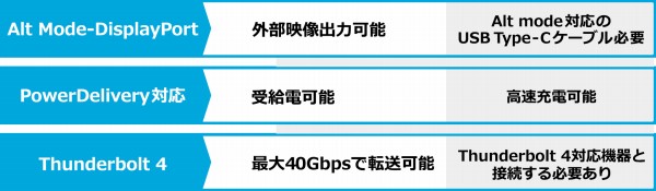 2つあるType-C端子は両方ともDisplayPort/PowerDeliveryに対応。そのうちの1個はThunderboltにも対応しています。