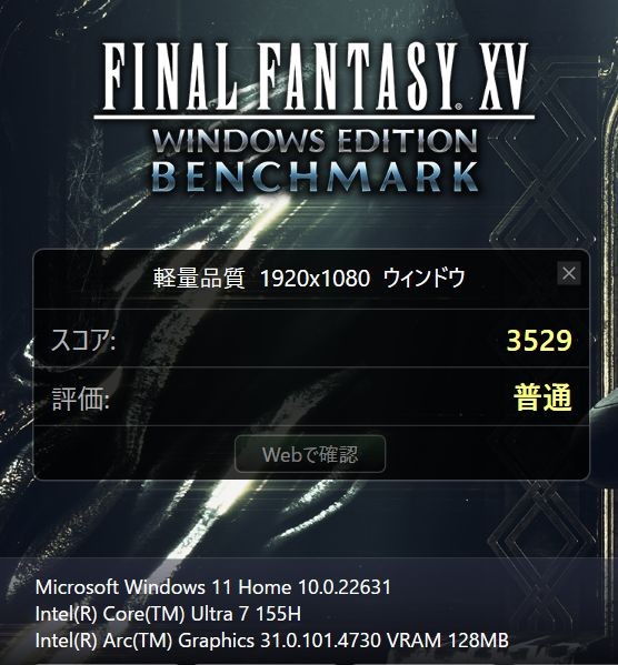 重い負荷のかかるFF15ベンチマークの結果はCore Ultra 5、Core Ultra 7とも「軽量品質」で「普通」、「標準品質」で「普通」、「高品質」で「重い」。