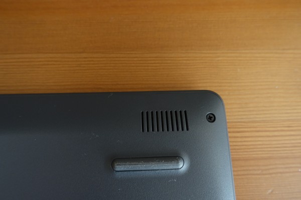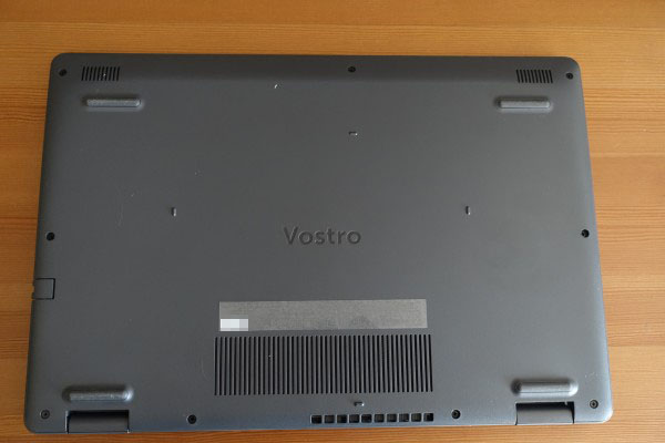 ![]() 通気孔が配置されているほか、中央に「Vostro」のロゴが刻み込まれています。継ぎ目はなく、簡単には筐体内部にアクセスできない仕様になっています。バッテリは内蔵されています。