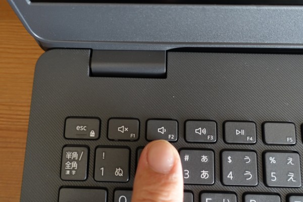 サウンドに広がりがあるのに加え、音のこもりはそれほど気になりません。もちろんエントリノートPCのため、全体的にシャカシャカした感じはすますが、聞いていて心地悪い感じはしないですね。 エントリクラスのノートPCのサウンドとしては上出来だと思います(あくまで個人的感想です)。 ![]() ファンクションキーのF1キーを押せば音声オフ、F2キーを押せば音量下げ、F3キーを押せば音量上げを実行できます。気軽に音量を調整できるので便利。