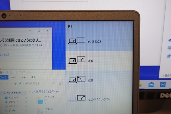 ![]() 「PC画面のみ」「複製」「拡張」「セカンドスクリーンのみ」の中から選択することで、外部モニタの表示方法を選べます。