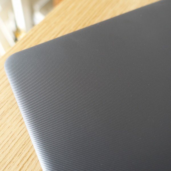 ![]() 天板部の表面には斜め細かい線が入ったデザインを採用。触ると少し凸凹しています。感触はさらっとしていますね。べとつきにくいうえ、持ちあげたときに滑りにくいです。