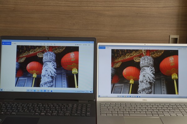 ![]() 15.6インチのWVAパネル(最大解像度1920×1080ドット)を搭載したデルInspiron 15 5502と比較してみました(写真左がVostro 15 3000(3500))。やはり、WVAパネルを搭載したモデルと比べると精細感/鮮やかは劣ります。