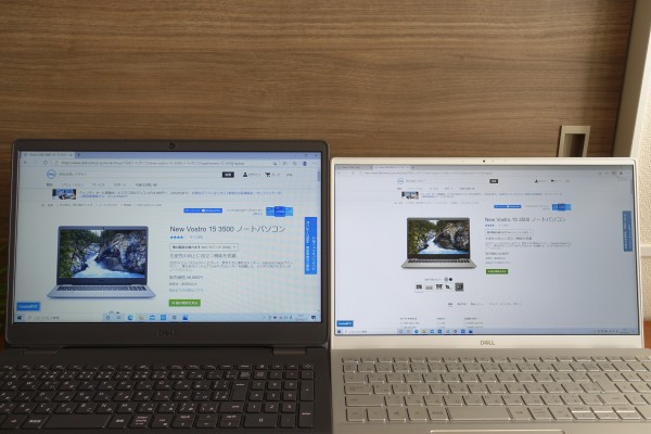 ![]() 光沢パネルを搭載したモデルと比較してみました。左がVostro 15 3000(3500)。右の光沢パネル搭載モデルでは、映り込みが発生していますが、Vostro 15 3000(3500)ではほとんど発生していないのがわかります。