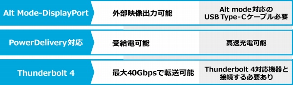 HDMI端子/カードリーダーは用意されていませんが、Type-C端子は3つともDisplayPort/PowerDelivery/Thunderboltに対応しています。