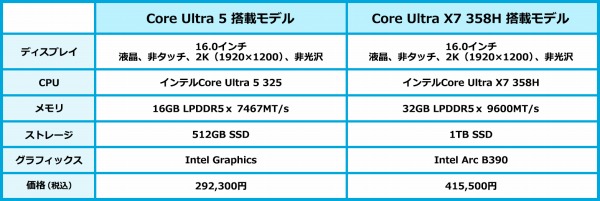 Core Ultra X7プロセッサ搭載の最小構成(Core Ultra X7 358H/32GBメモリ/1TB SSD/液晶パネル)が403,800円(税込)。