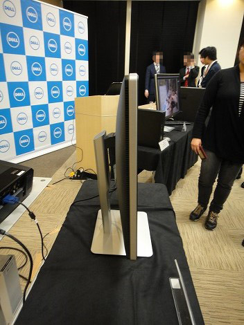 P2815QがUPシリーズの2モデルと違う点として ・コストパフォーマンスに優れたTNパネルを搭載している ・PremierColorテクノロジーを搭載していない という2つが挙げられます。 なので、P2815Qは、高画質/忠実な色再現性が求められるプロフェッショナルワークではなく、広い表示領域を確保することで効率的な作業が可能となるオフィスワーク(設計、金融、地図、データサイエンティストなど)に最適なモニタだということができます。家庭でも、デュアルモニタ構成にしている場合、P2815Qを導入することでモニタ1台に集約することができ、効率アップを図ることが可能です。 ![]() 会場に展示されていたもう1台のP2815Qには、4K動画のスナップショットが表示されていました。 最初見たとき、ちょっともっさりした感じがしましたが、これは隣に上位モデルであるUP3214Qが展示されていて、その画質のすばらしさに目を奪われたからかもしれません。 上の写真では、ちょっと白っぽく映っていますが、実際はもうちょっと落ち着いたトーンになっています。 ![]() 左右の視野角を確認してみました。 ![]() スペックでは水平方向で170°の視野角を確保。 ![]() イベントで表示されていた画像。すごく精細感があって綺麗。 ![]() 細かい部分を見てみてもすごく美しい。 ![]() ![]() 発表会では動画を見ることができなかったのですが、4Kモニタイベントでは4K動画を見る機会を得られました。 リフレッシュレートの値が30Hzと低く、滑らかな表現は難しいのではないか、と思っていましたが、実際に見てみると、思っていたよりも綺麗!個人的には、一般的な4K動画であれば、十分堪えられるレベルだと思います。よろ滑らかな表現が必要となるゲームとなると、ちょっと厳しいかもしれませんが・・・ ![]() もちろん動画を堪能するには、出力側の性能も重要。この日、接続されていたのは、コンシューマ向けモデルよりもハイスペックなワークステーションのPrecisionノート。やっぱり4Kを存分に楽しむには、高性能なマシンを用意した方がいいでしょうね。 ![]() ベース部分/スタンドはシルバーを基調としたシンプルなデザインになっています。 ![]() 横から見たところ。それほど設置面積をとっていないのがわかります。 ![]() 背面部。従来のDELLモニタと同じく、シルバーとブラックのツートンカラーになっています。スタンドには、ケーブルを通すための穴が設けられています。 このスタンド部分は簡単に取り外すことができます。取り付けにあたってはVESAに対応しているので、VESA規格のアームなどに装着することが可能です。 ![]() P2815Qでは、調整機能も充実しています。まずは左右回転機能。左右45°まで回転することができます。 ただ、回転しようとしたとき、ベース部分を押さえないと、ちょっと固くて回転することができませんでした。このあたり、販売時には改善されるのかな・・・ ![]() 高さ調整機能も搭載。 ![]() 調整幅は115mm。 ![]() もちろんチルト(前後傾斜)機能も搭載。液晶の傾きを調整できます。 ![]() また、縦横回転(ピボット)機能も搭載しています。 ![]() これだけの解像度を持つパネルを縦表示できるので、縦に長いアプリ(Webブラウザなど)を頻繁に利用する人にとってはありがたいかも。 回転するのにそれほど力はいりません。ただし、縦横回転しても、自動的に画面表示を切り替えてくれる機能は搭載していないので、手動で切り替える必要があります。 ![]() 背面部の中央下部に各種端子類が配置されています。カバーを装着可能。 ![]() 搭載している端子類は上の図のとおり。出力端子として、DisplayPort(1.2)、Mini-DisplayPort、HDMI1.4(MHL 2.0)が用意されています。 P2815Qのマニュアル(PDFファイルが開きます)を参照すると、標準でDisplayPortケーブル(ミニDP対DP)が付いてくるので、P2815QのMini-DisplayPortとPC側のDisplayPortを接続するのに使用できます。 DisplayPort出力端子を搭載しているので、ディジーチェーン接続が可能です。 USBアップストリームポートを備えており、PC側でUSBケーブルで接続することで、残りのUSB 3.0ダウンストリームポートを利用できます。できれば、このUSB端子が側面部にあると使いやすかったんでけどね。残念ながら、USB端子は背面部にしか用意されていません。USB 3.0アップストリームケーブルは標準で付いてきます。 ![]() 端子類が背面部の中央下部に配置されているため、そのままでは接続しづらいのですが、このP2815Qは縦横回転が可能なので、縦位置にすれば、上の写真のように、簡単に接続作業を行うことができます。このとき、ケーブル類がからまないよう注意が必要です。 ![]() 縦表示したときに注意しなければならないのが視野角。というのもP2815Qのパネルは、水平方向の視野角は170°を確保していますが、垂直方向は160°となっており、水平方向よりも狭くなっているからです。 横向きで表示しているとき、下からのぞき込むことは少ないので、この視野角の狭さはあまり問題とはならないのですが、縦表示に